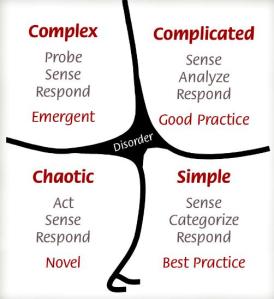 - Complex, where the relationship between cause and effect can only be perceived in retrospect, but not in advance, the approach is to Probe – Sense – Respond and we can sense emergent practice.